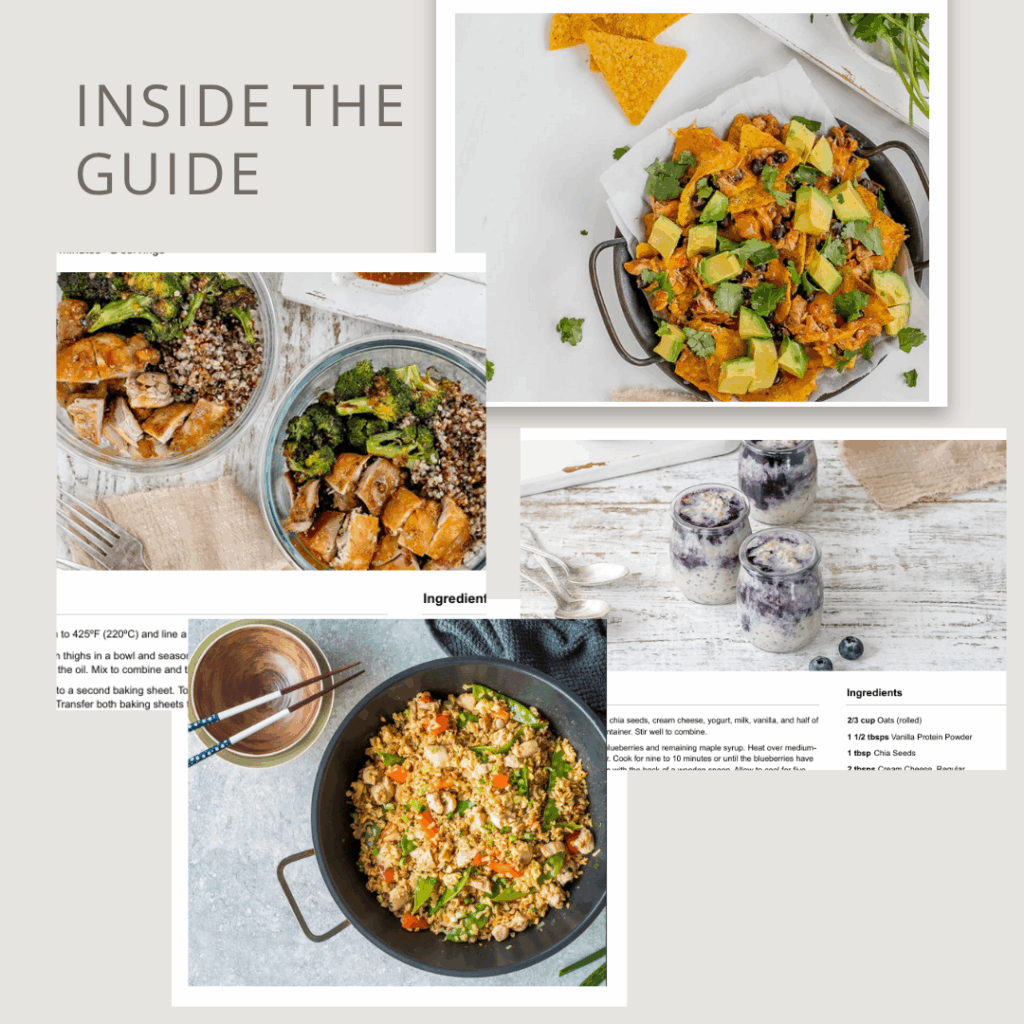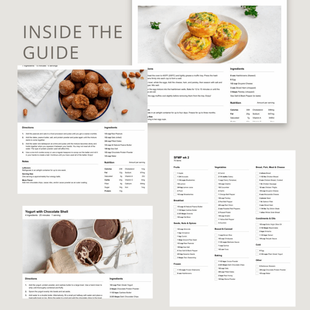 This guide includes five full weeks of meal ideas — with three breakfasts, three snack, three lunch, and five dinner options each week. Inside, you’ll also find a handy section with shopping tips, favorite kitchen tools, and super easy meal combinations using everyday products to help you build fast, balanced meals. Think of it as your “don’t think, just do” plan for real-life eating — simple, flexible, and satisfying.