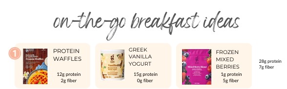 Here is a look at the breakfast shortcut ideas. There are seven breakfast ideas (and so much more with quick meal ideas, easy sides to buy, and helpful charts with protein and fiber sources.
